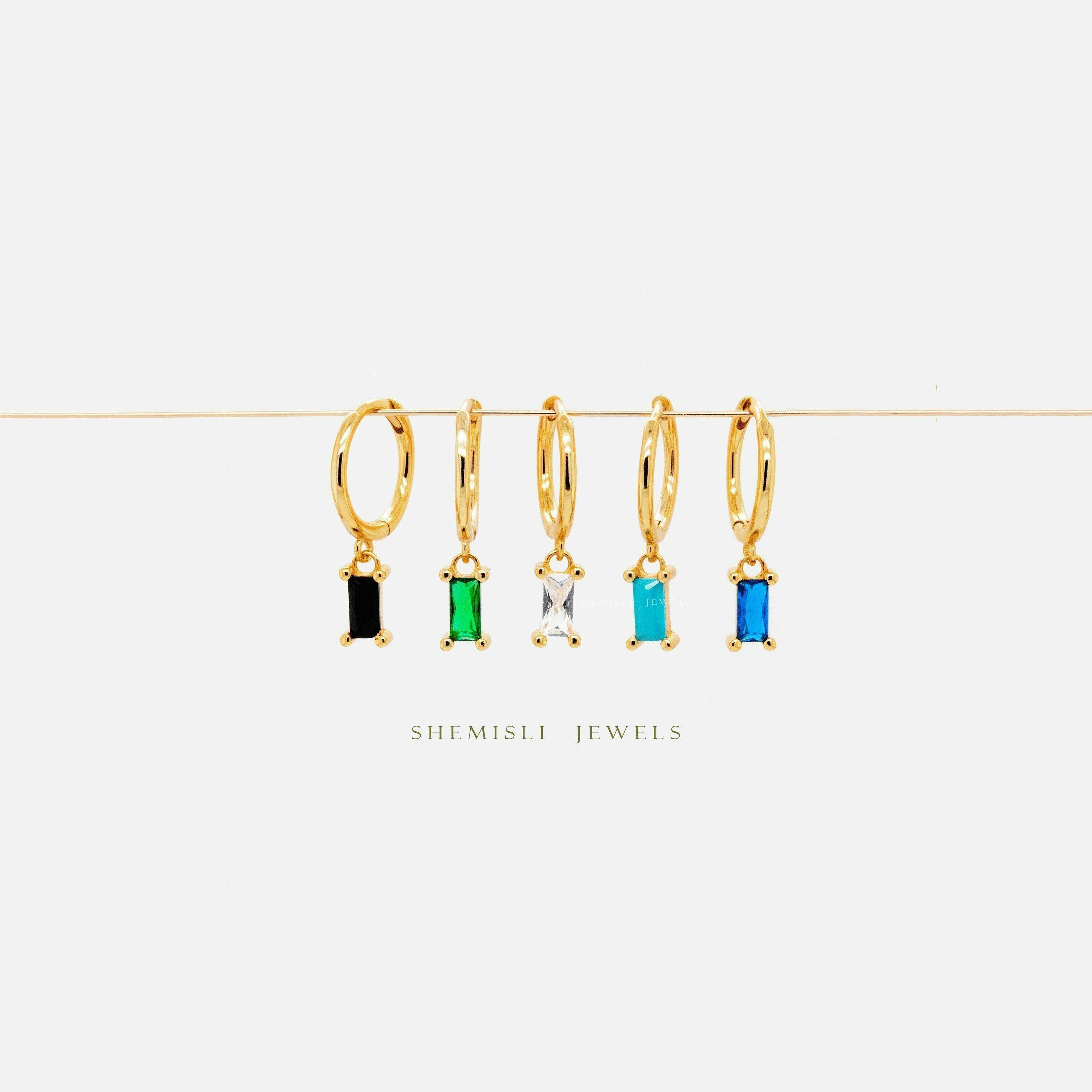 Baguette CZ Drop Hoop Earring, White, Emerald, Turquoise, Sapphire,