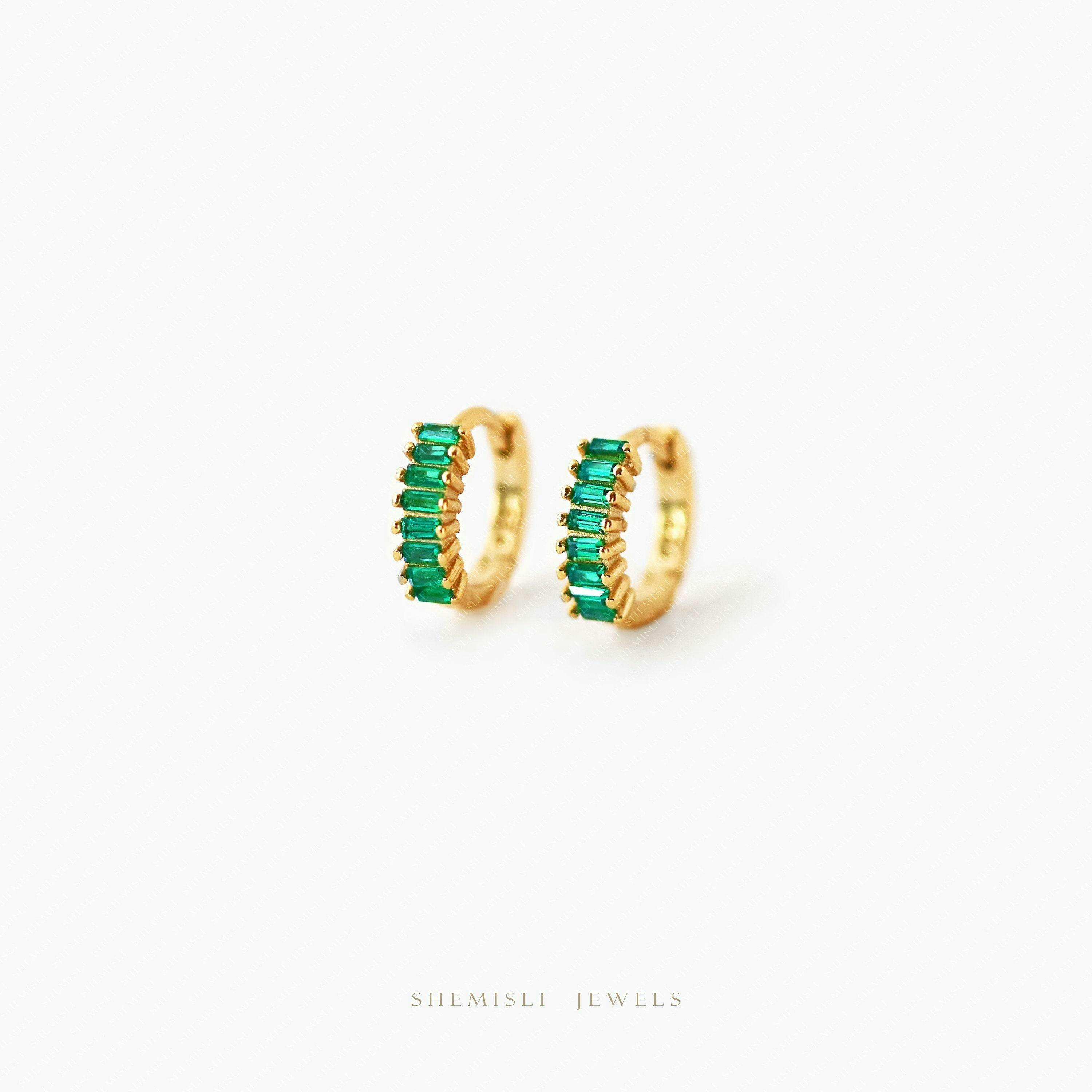 Baguette CZ Hoop Earring, White Stone, Emerald, Turquoise, Sapphire,