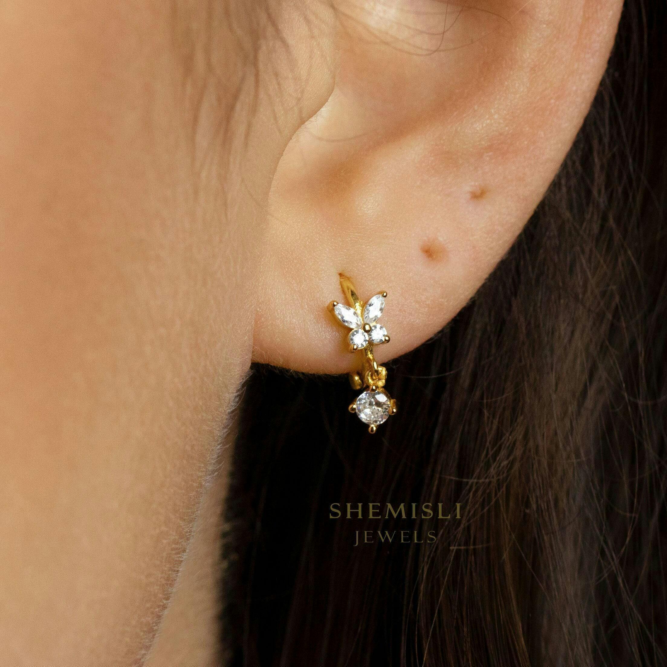 Butterfly CZ Drop Hoop Earring, Huggies, Unisex, Gold, Silver