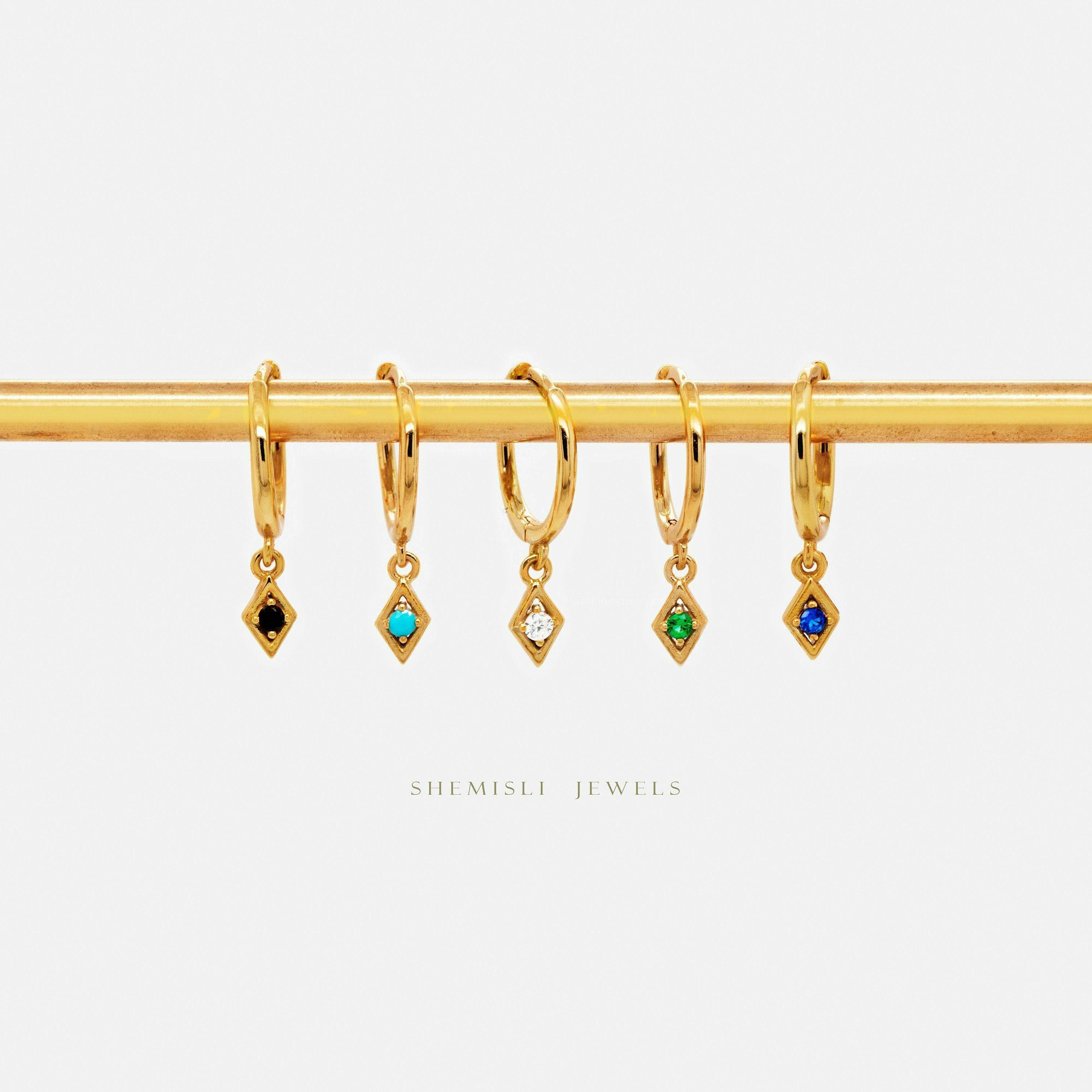 CZ Drop Dangle Hoop Earring, White Stone, Emerald, Turquoise,