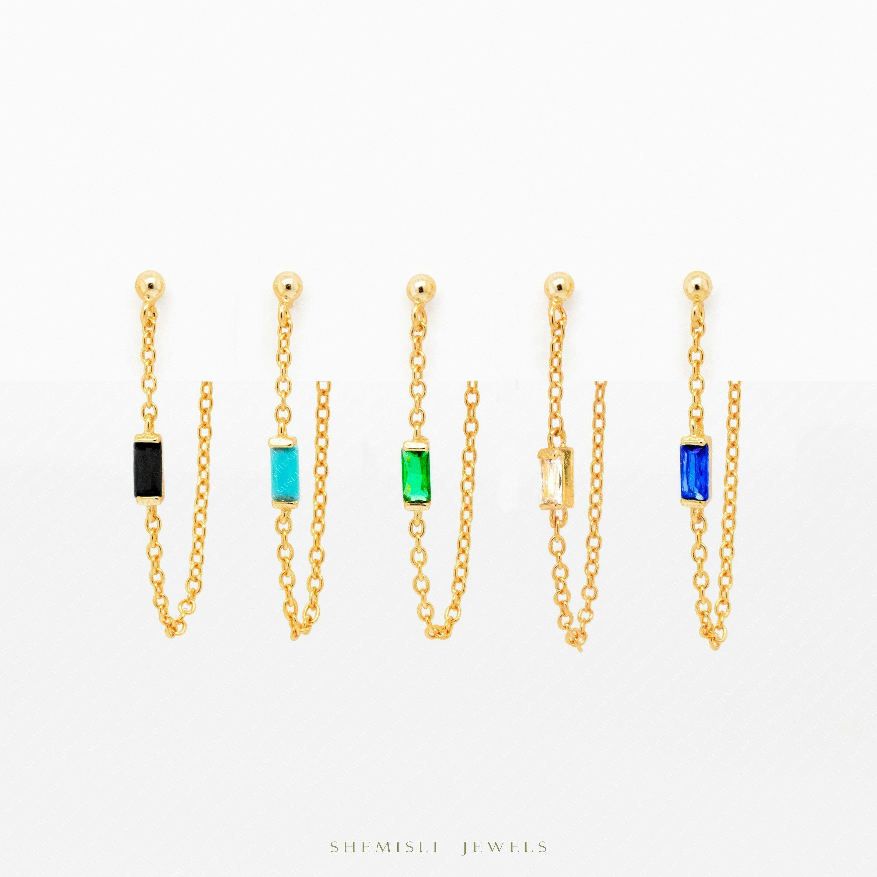 Dainty Baguette Chain Stud, White, Emerald, Turquoise, Sapphire, Black,
