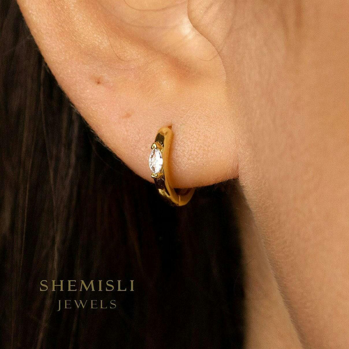 Dainty Marquise CZ Hoop Earring, Huggies, Unisex, Gold, Silver