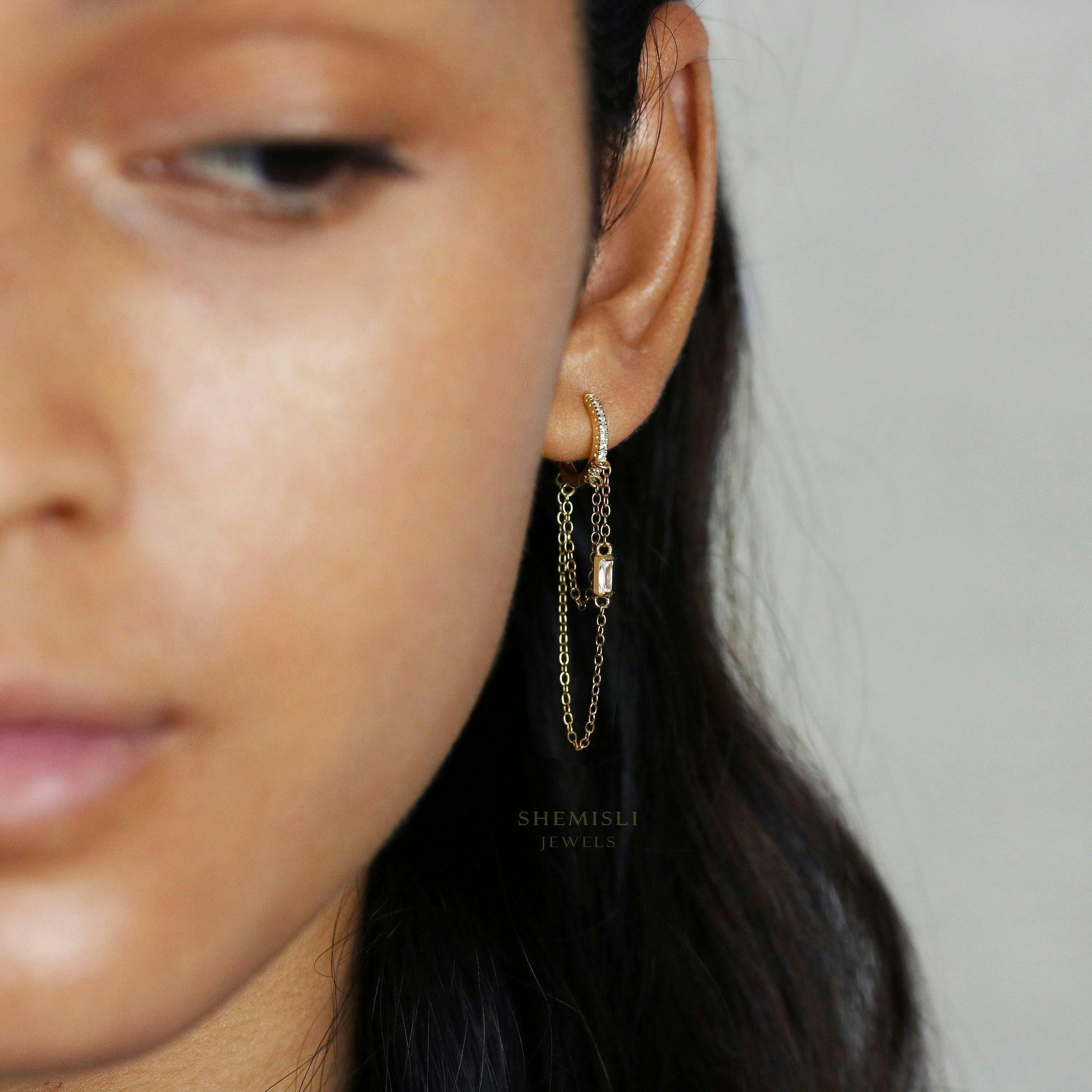 Dangle Chain CZ Hoop Earring, Huggies, Unisex, Gold, Silver