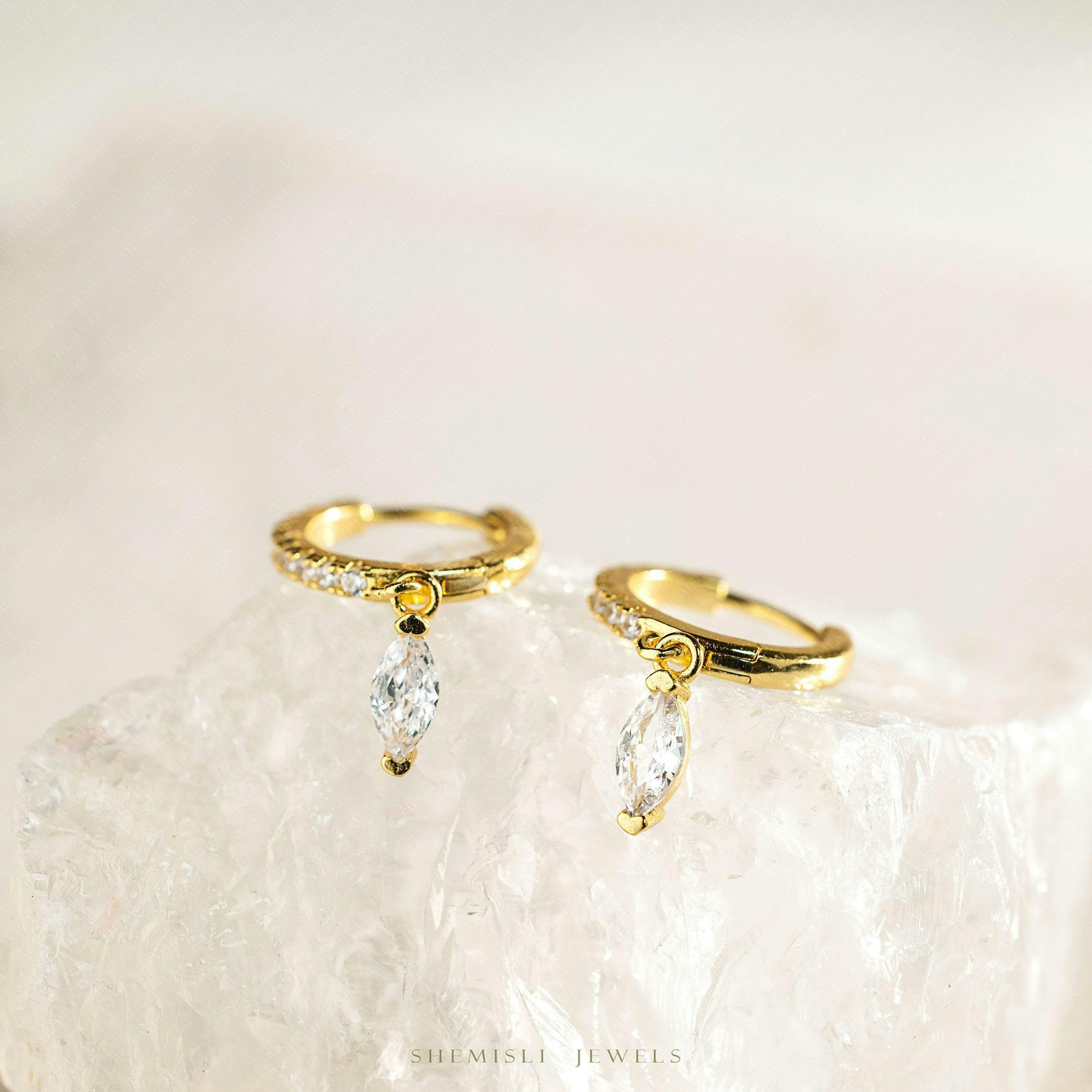 Marquise White CZ Drop Hoop Earring, Huggies, Unisex, Gold,