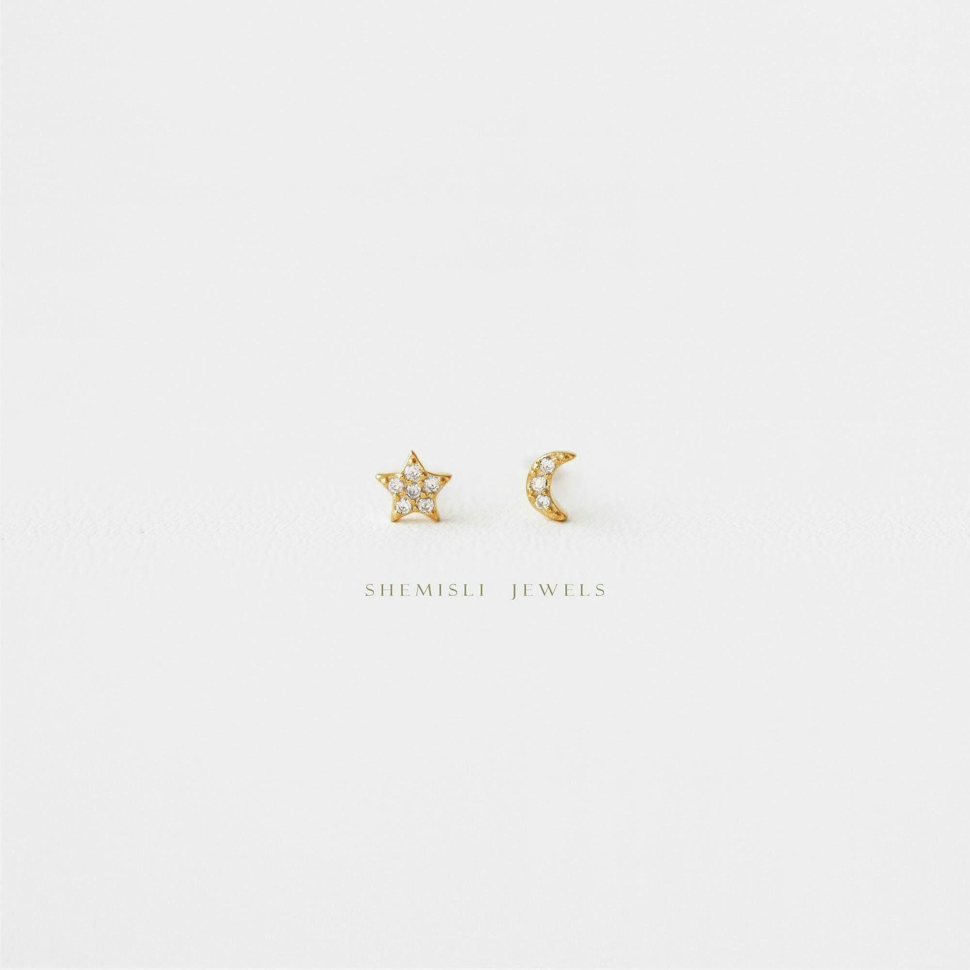 Mismatched Moon and Star Stud, Celestial Earrings, 5 Pointed