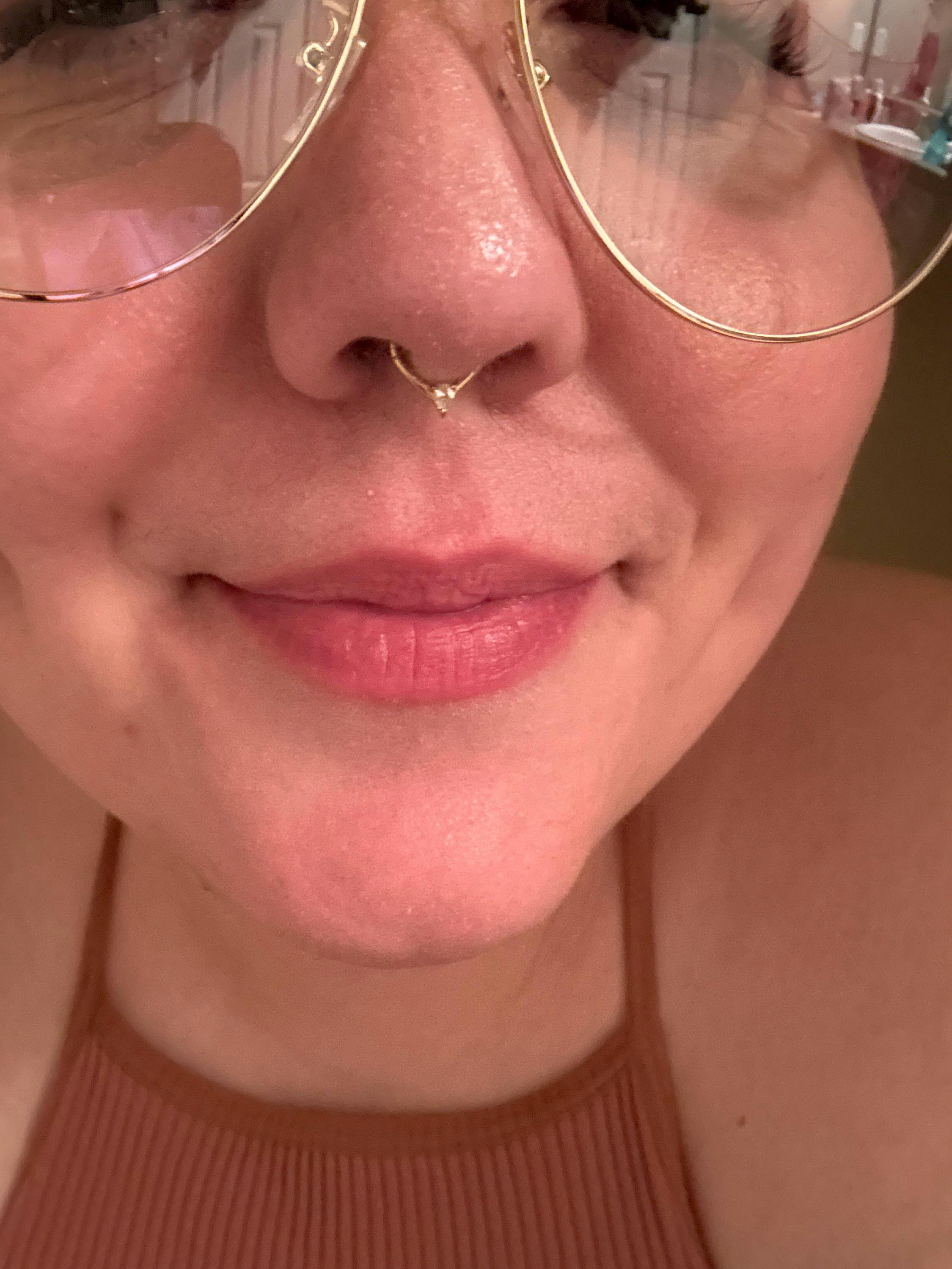 My favourite piece of septum jewellery ever. I wasn't sure what to expect because this was a very affordable nose ring. I wasn't sure if it would hurt my sensitive skin or look wonky, but it's the perfect shape and size for what I wanted. I have a septum ring, but I like to keep things subtle with it, but I found it wasn't standing out enough. I figured a piece like this had some sparkle without being overwhelming. I think the shape is absolutely fantastic. I have been wearing this for a few months now and just remembered that I should probably do a review because I am ordering all the colors. Attached a picture of me and my jammies just to show how it sits on the face and I couldn't be happier.