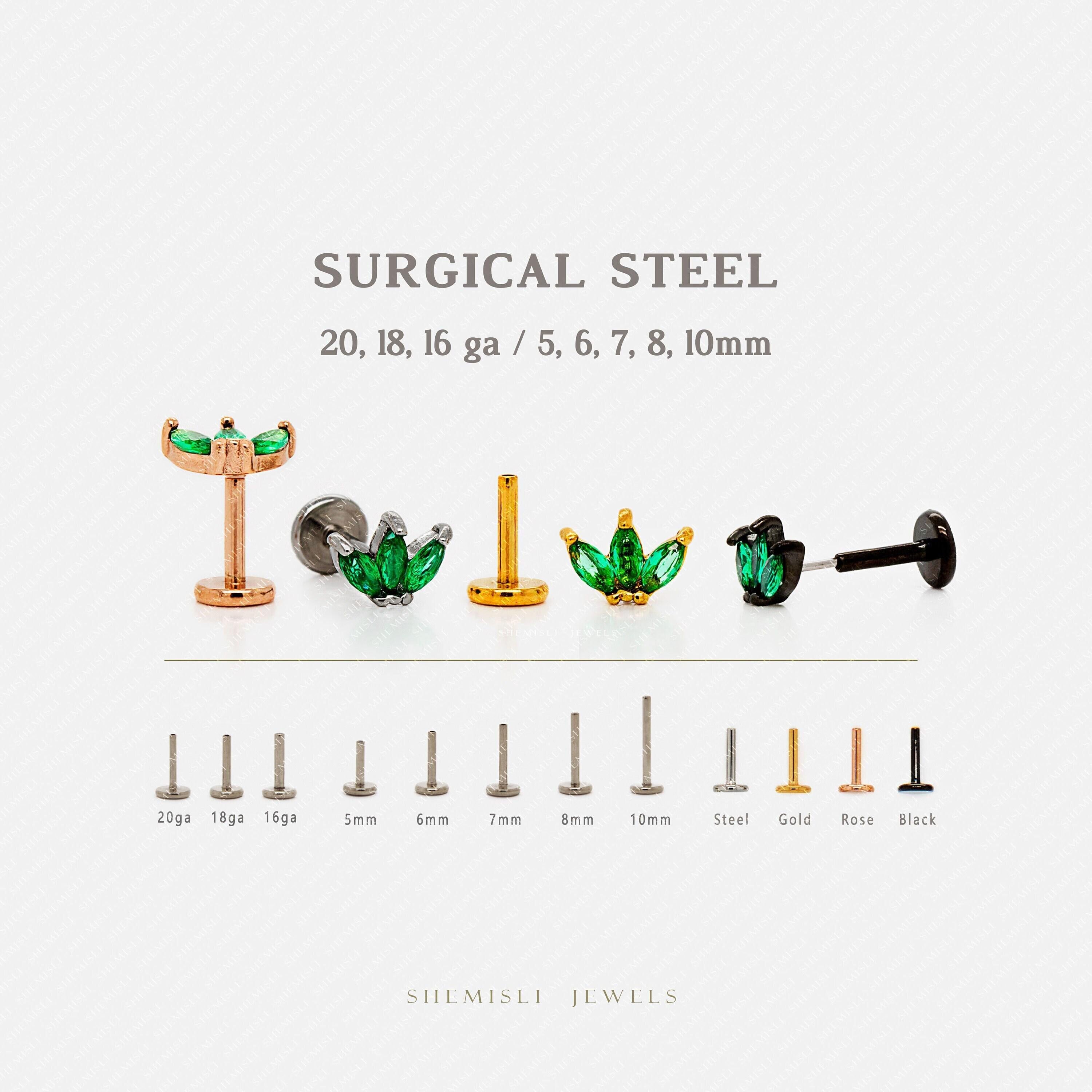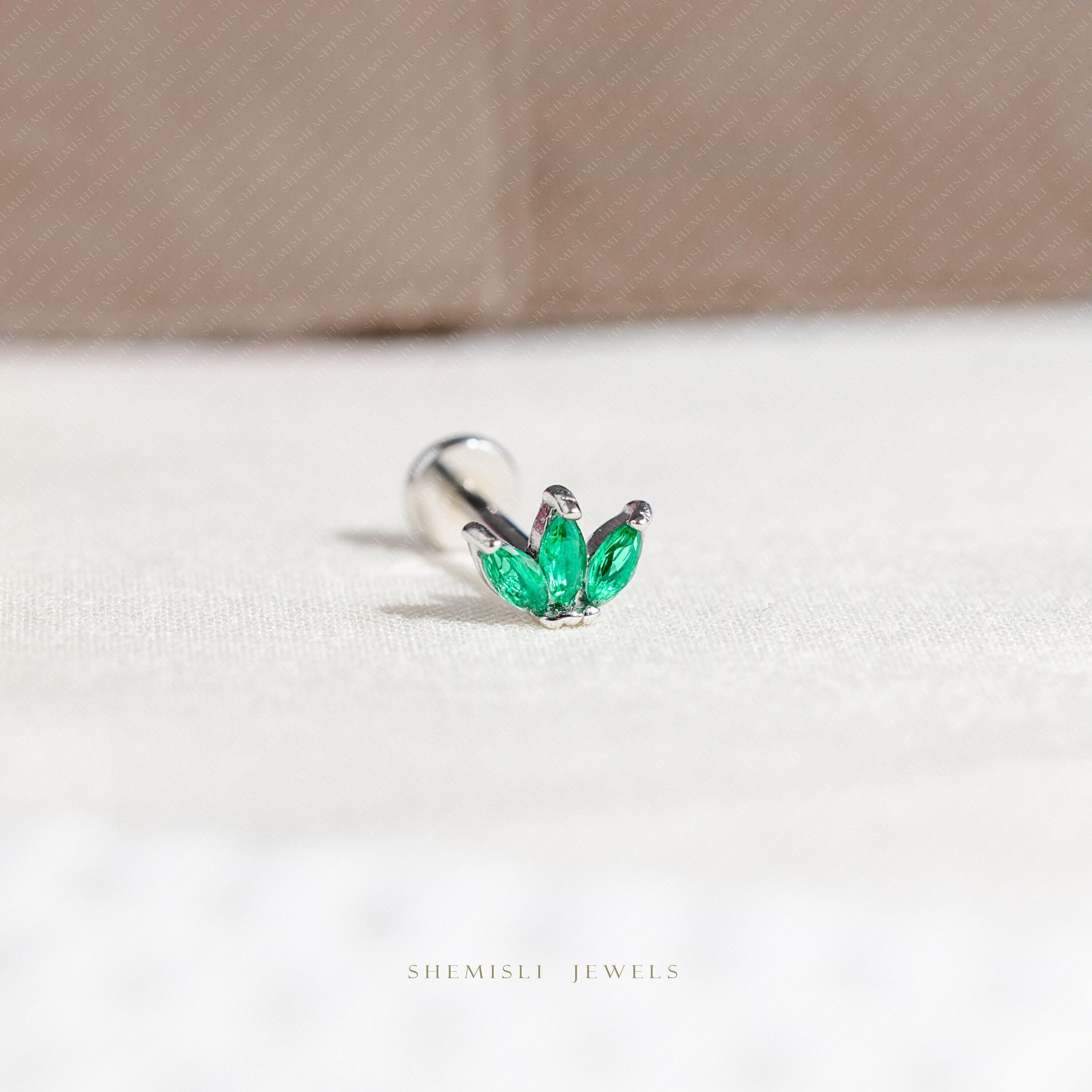 3-Leaf Emerald Nose Stud, Threadless Flat Back, Minimalist Style,