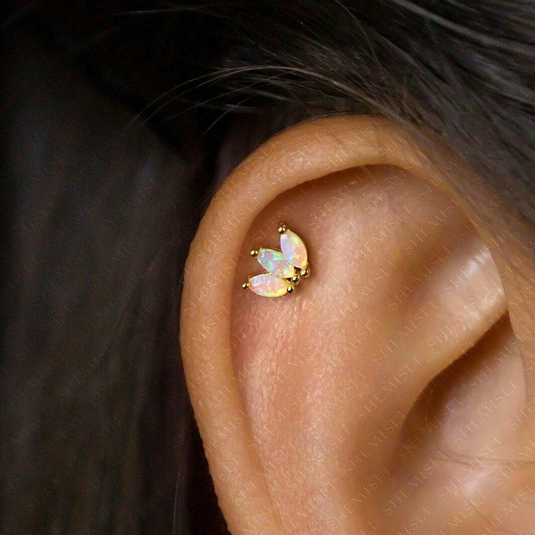 Tiny 3 Leaf Opal Threadless Flat Back Earring, 20,18,16ga,