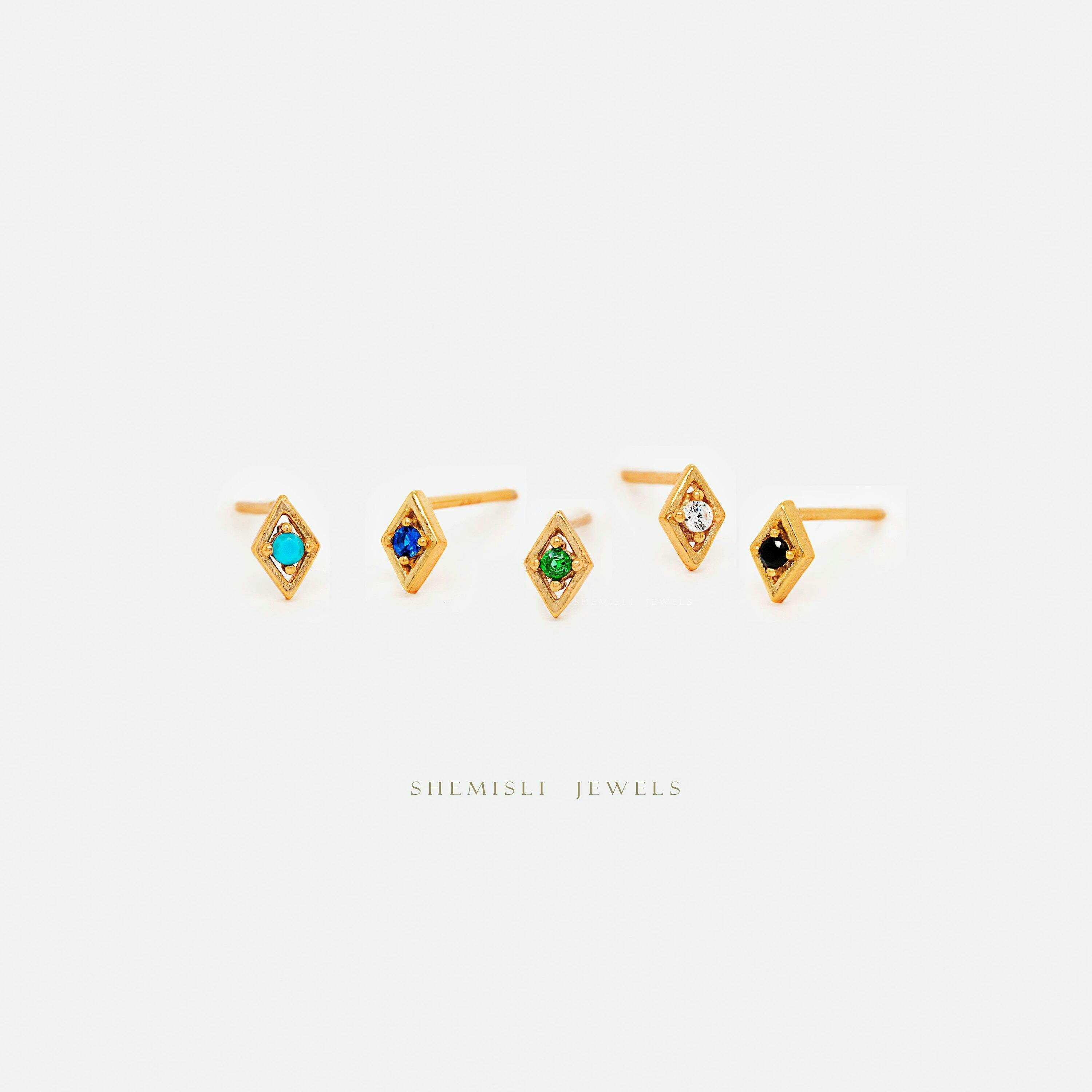 Tiny CZ Diamond Shape Stud, White, Emerald, Turquoise, Sapphire,