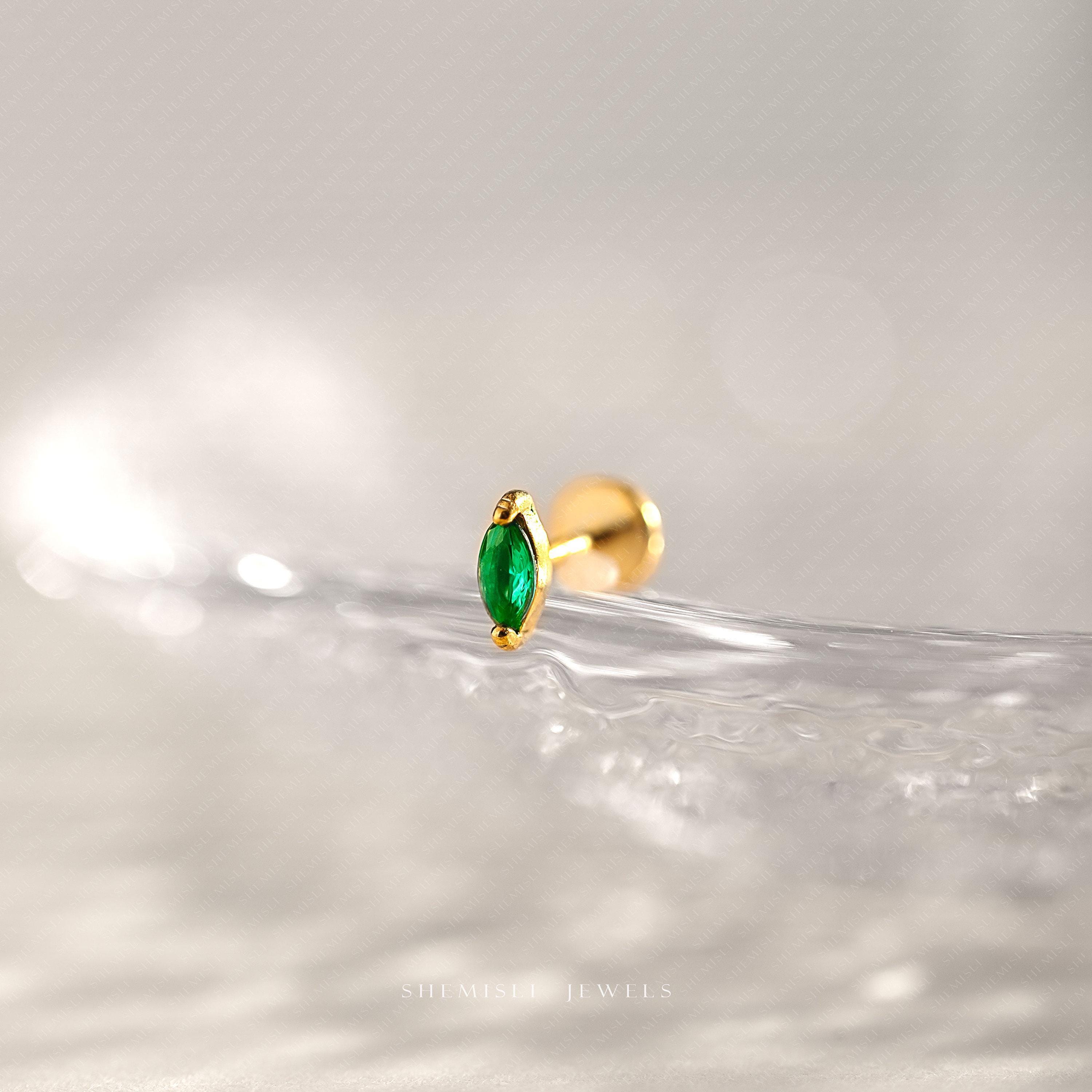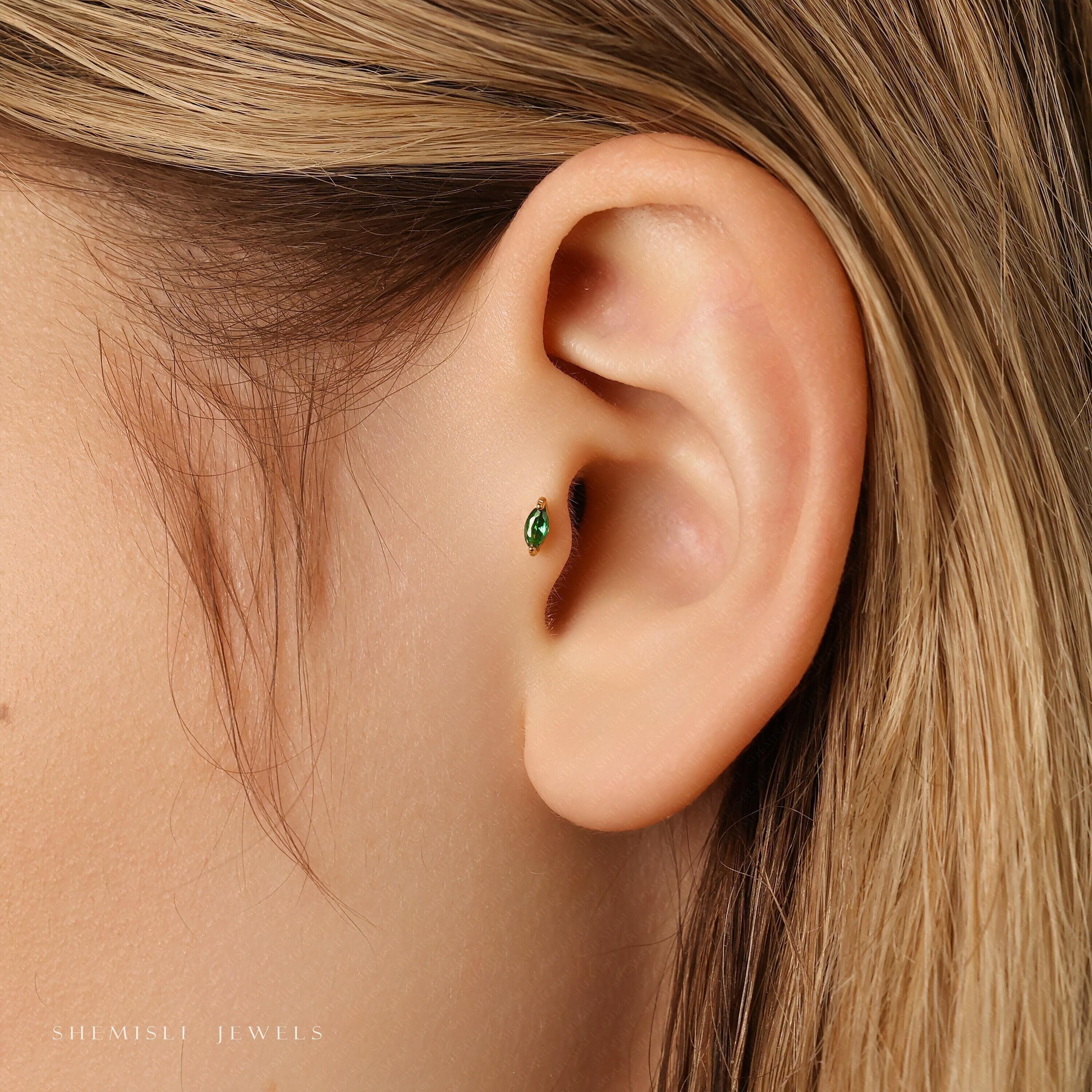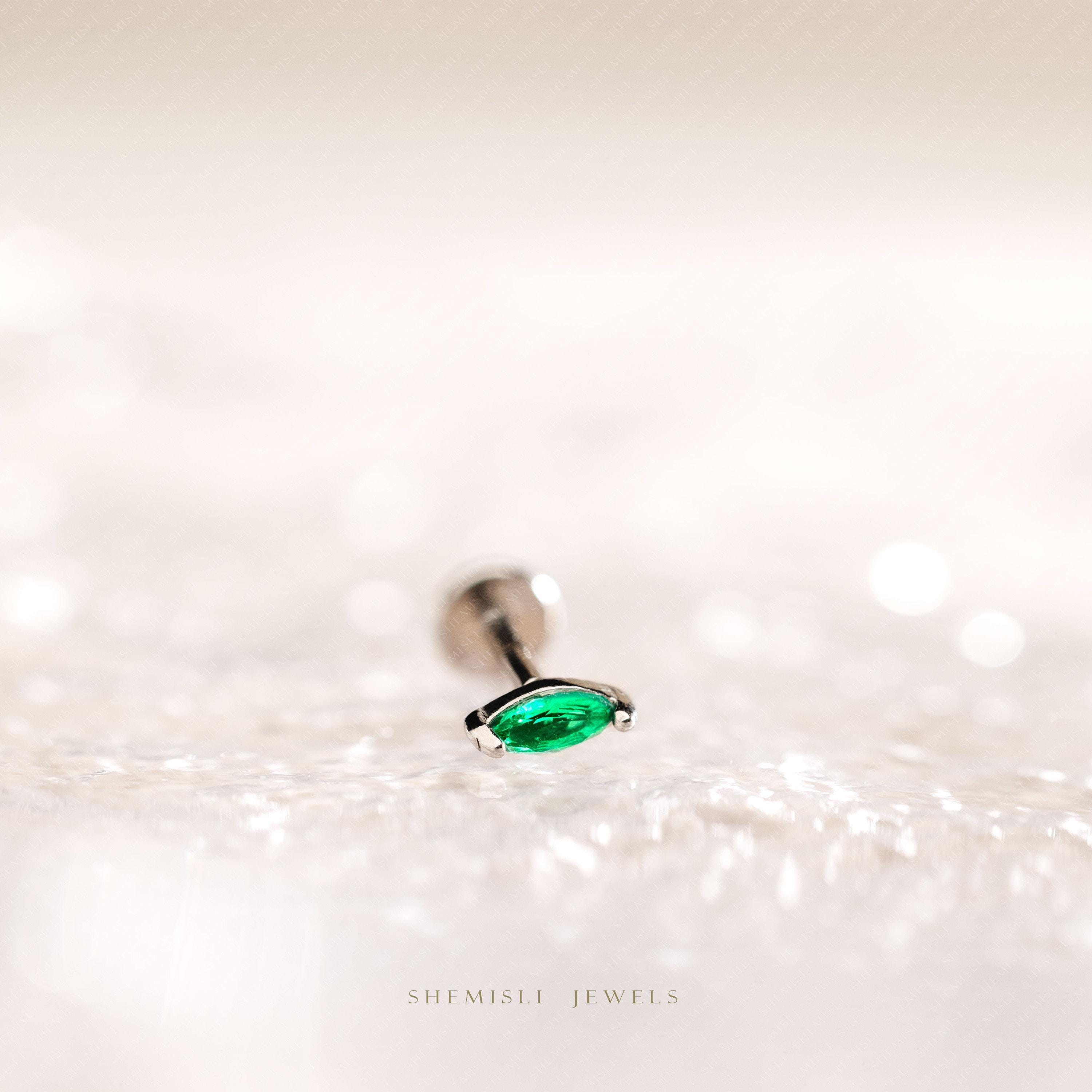 Tiny Emerald Marquise Threadless Flat Back Tragus Stud, 20,18,16ga,