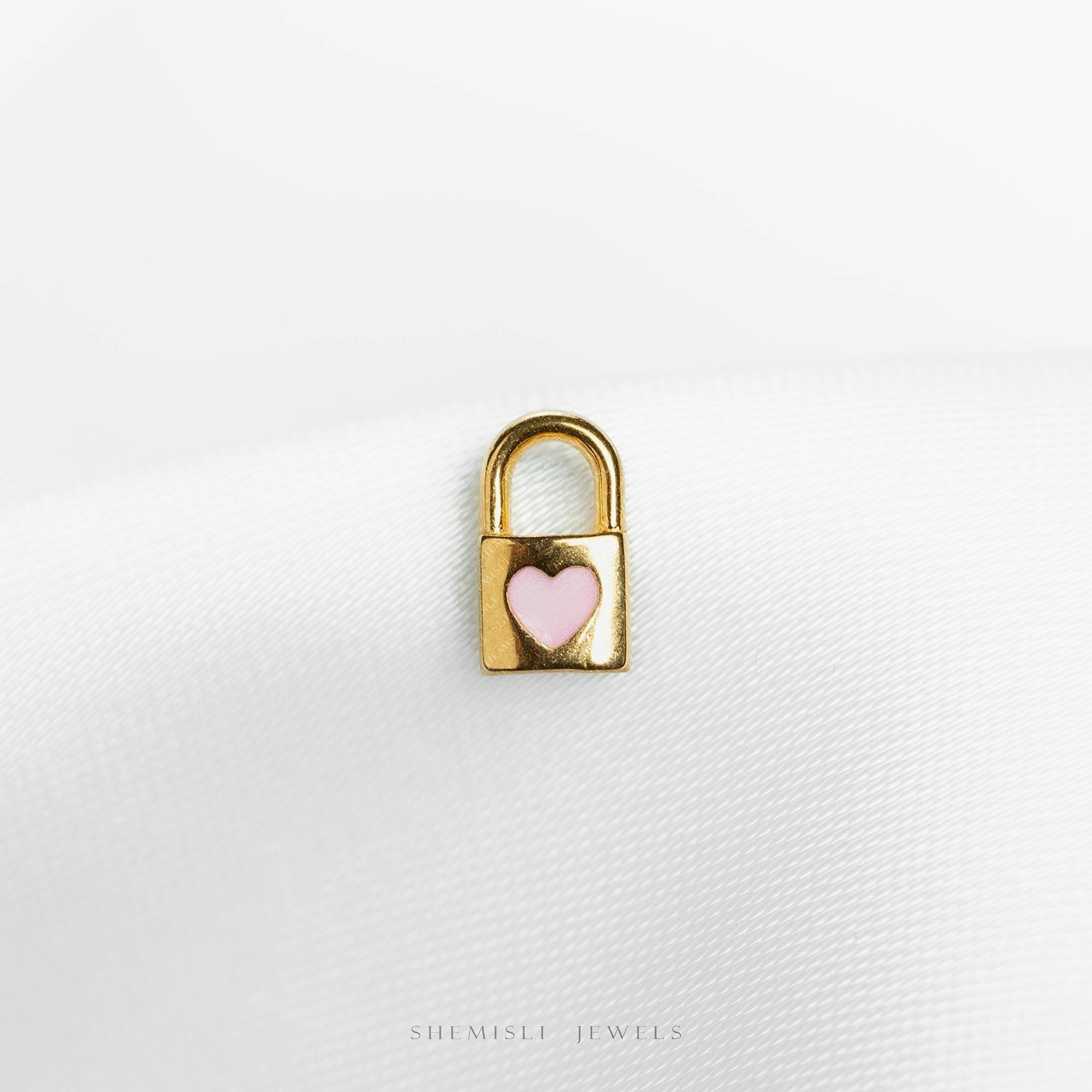 Tiny Padlock with Pink Heart Threadless Flat Back Earring,