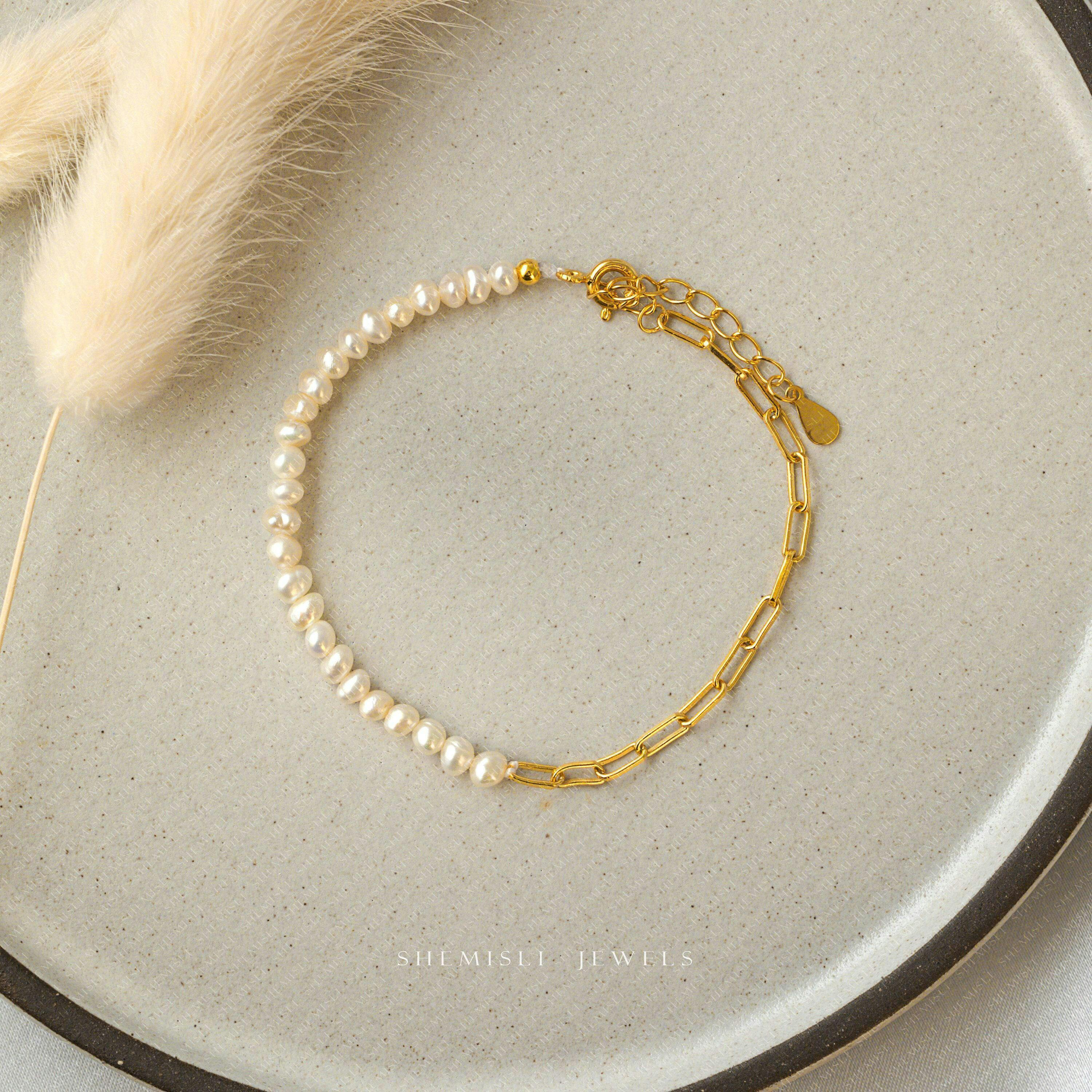 Tiny Paper Clip Chain and Freshwater Pearl Bracelet, Unisex,