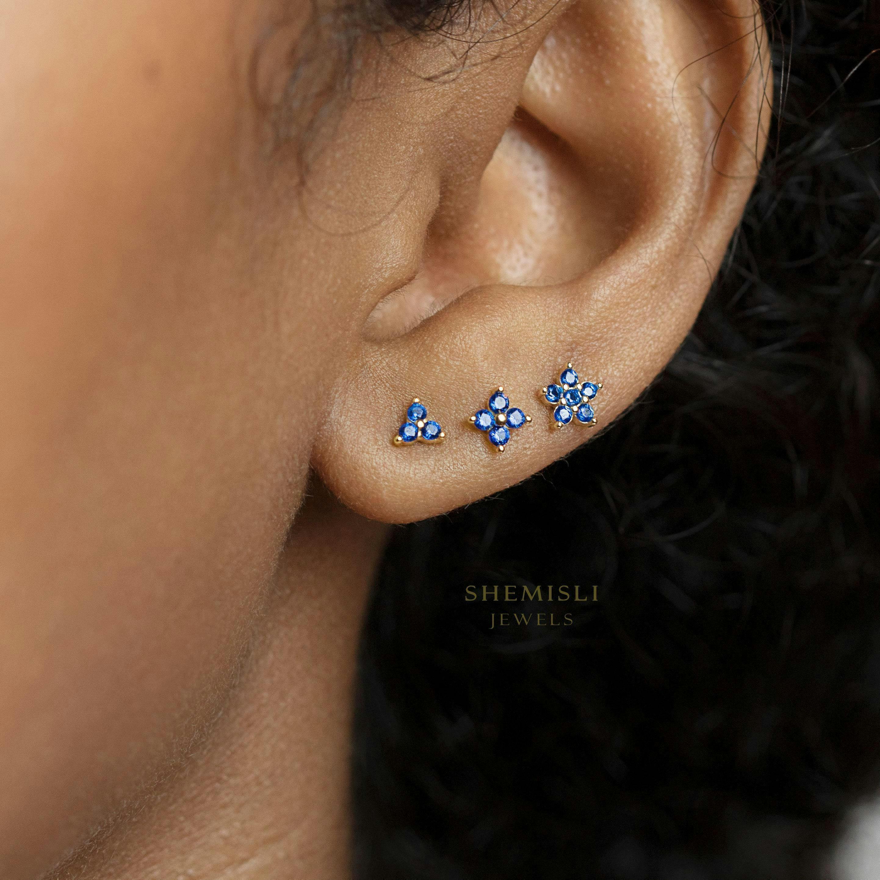 Tiny Sapphire Stone Flower Stud, Unisex, Gold, Silver SHEMISLI