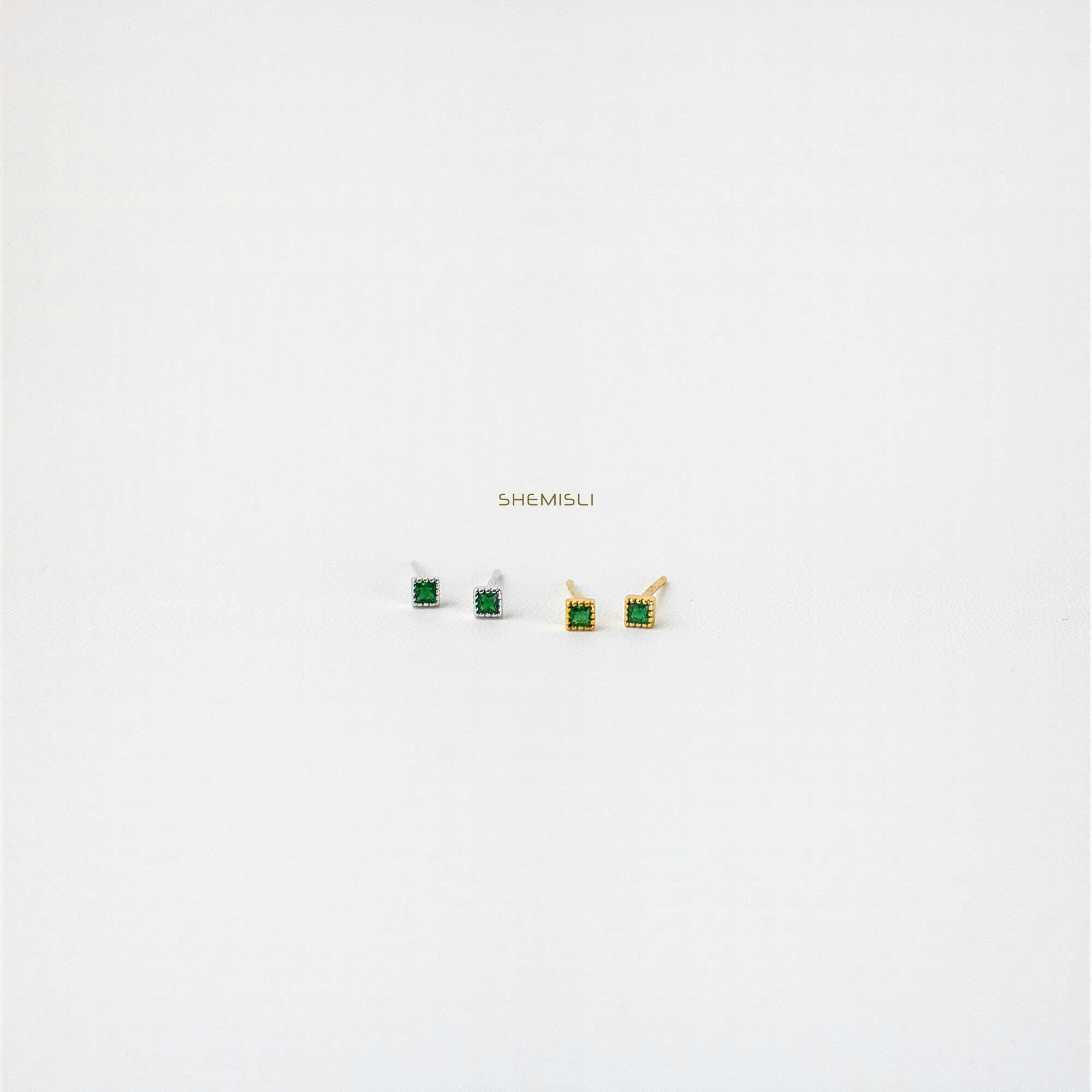 Tiny Square CZ Stud, Cube Earring, White, Emerald, Turquoise,