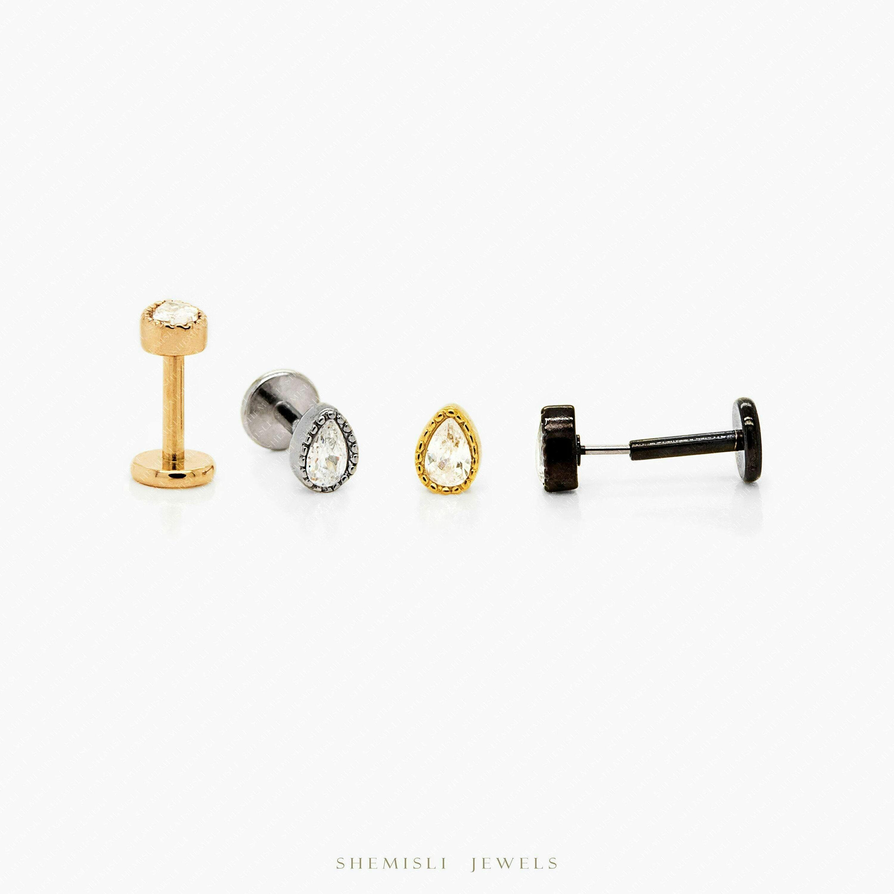 Tiny Teardrop White Stone Threadless Flat Back Earring, 20,18,16ga,